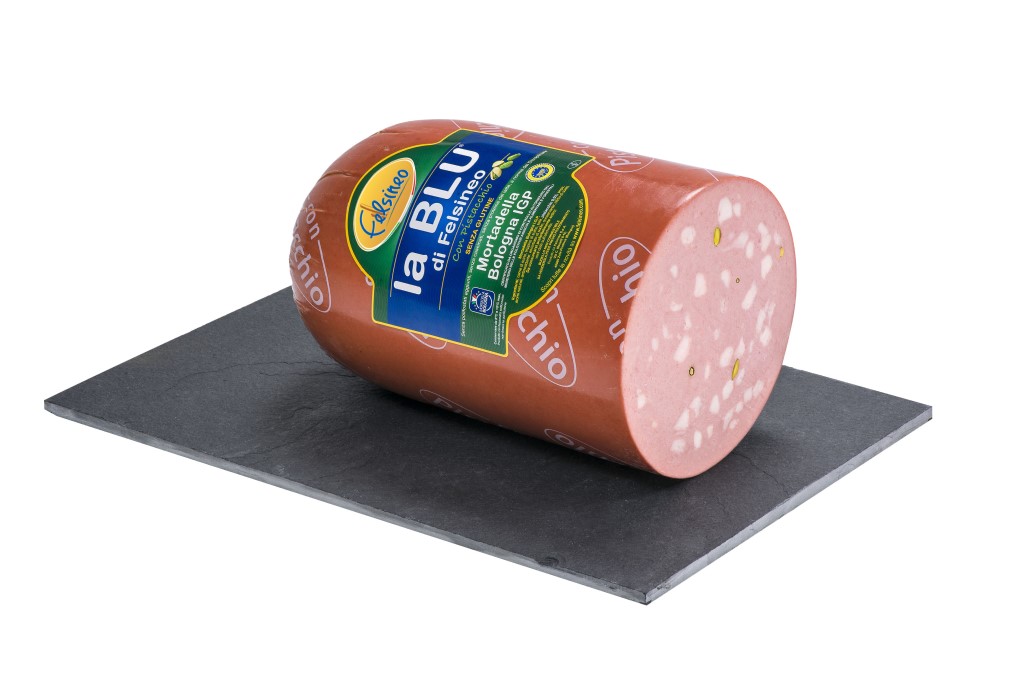 Mortadella di puro suino insaccata in budelli sintetici o naturali, confezionata sottovuoto e non. Prodotta nel rispetto del Disciplinare Mortadella Bologna ad Indicazione Geografica Protetta. Budello non commestibile.